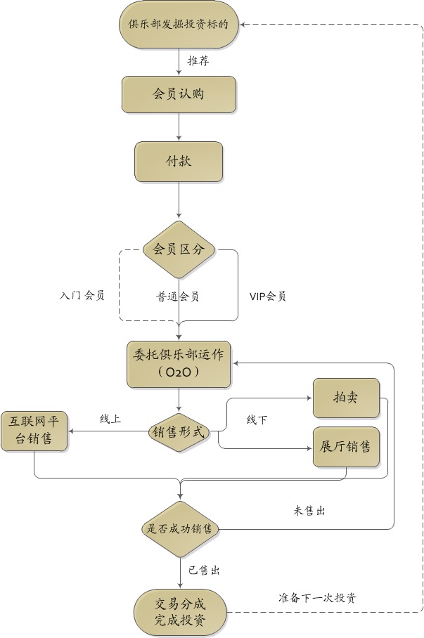 俱乐部采取零会费制,入门会员无门槛,普通会员、VIP会员加入时,只需预存或直接收藏3万、6万元以上可获得资格,预存款仅用于艺术投资。入门会员无需审核直接消费,普通会员、VIP会员,提交入会申请,经审核通过后获取资格。每个会员都以自家所需作为艺术品投资的开始,比如说有一个会员拥有一处住房,需要挂大大小小10幅油画或者国画,那么他的艺术品投资之旅就从这10幅画开始。当俱乐部发现有增值潜力的画家和作品处于低估时,也就是俗称捡漏的时候,会在第一时间组织大家认购收藏,也就是所谓的建仓。普通会员、VIP会员付款后,画的所有权归会员所有,但画的5年销售权归俱乐部所有,会员可以选择自行存放或托管俱乐部。在收藏期间,俱乐部有权根据作品的市场情况选择拍卖,一旦画被售出,俱乐部会按以下公式和会员分成:会员所得 = 会员收藏价 +(普通会员 50%、VIP会员60%)X(成交价 - 会员收藏价 – 相关费用- 成交价 X 税率),入门会员仅作为一般消费者不参与会员所得。在这种模式下,由于会员初始投入资金加上投资获利不断积累,会员的投资收益不断扩大,会员家里收藏的10幅画经过不断投资更新,品质也会越来越高,最终实现艺术投资的价值。整个投资过程中,会员应遵守以个人所需作为投资底线,再加上是实物交割,投资风险就会降到最低。换句话说,会员最大的风险就是,以远低于市场的价格买了自己需要的画而无法获取投资收益。俱乐部不会主动把已经被会员收藏的画二次卖给其他会员,除非是在买卖双方会员知情并同意的情况下进行。